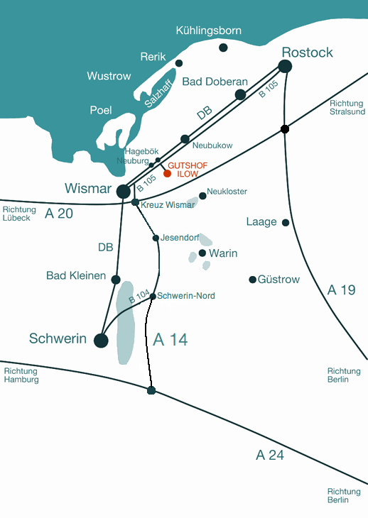 Der Gutshof Ilow in der Gemeinde Neuburg, 16 km nordöstlich von Wismar, ist von der A 14 und von der A 20 über das Autobahnkreuz Wismar, Abfahrt Insel Poel in Richtung Rostock, auf der B105 zu erreichen.
